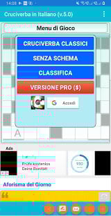 Crosswords in Italian Free, Medium-high levelItalian Crosswords (Crosswords) for Android, is a puzzle game that offers the opportunity to play and have fun with the classic crosswords.The Crosswords are available in three different sizes:The total schemes available are 280:- 90 crosswords of 9x9 size- 70 crosswords of 11x11 size- 60 crosswords of 13x13 size- 60 crosswords of 15x15 size- 12 Crossword puzzles without schemeThe definitions of crossword puzzles are of medium / high difficulty.The solution is always available and also a button to check thecorrectness of the definitions inserted.It is also possible to enable advanced aids to show a single letter or a whole word.A PRO version of crossword puzzles is also available, with many more diagrams and without any advertising.Forward the pro version of the crossword puzzle game to join the new patterns that will be created from time to time.Try also the other puzzle games we've created:- Crucipuzzle- Crucyning- Mathematical Crosswords- Enigmatic changesHave fun