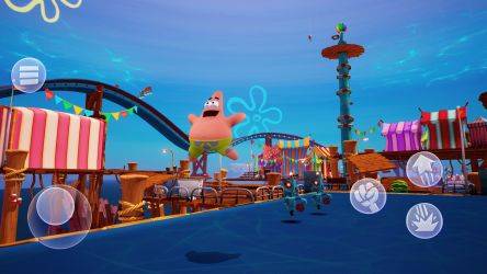 Props are also included in the game. The trampoline helps the player bounce further onto ledges or platforms, buttons activate certain things throughout the game, and the pressure pad acts like a button; however, its effect only works when the player is standing on the pressure pad, or has another object placed on it. Once anything on the pressure pad is removed, its effect disappears. There are also character-specific abilities, such as Sandy's ability to swing from a Texas hook, SpongeBob's ability to dive down with a bungee hook, and Patrick's ability to pick up and throw melons called "throw fruit" and ice cubes called "freeze fruit". While some areas can be navigated by any character, certain areas can only be done by specific characters because each area has unique abilities. SpongeBob can make a bubble helmet for head-butting enemies. Patrick can throw objects at buttons, robots, and pressure pads, and can throw "frozen fruit" into slime bodies to freeze them. Finally, Sandy can slide through huge gaps and destroy enemies and objects with her lasso.