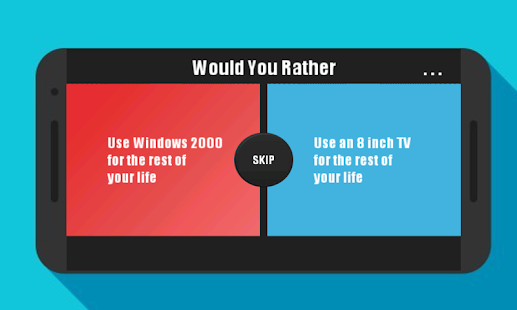 Would You Rather Reigns is a game where you have to choose between two difficult trivia.This trivia game contain many questions, most of them created by our community. Are you ready to make really difficult decisions? This is a continuation of our popular game would you rather.This type of game is the one played by the vast majority of youtubers doing the youtubers life.FEATURES- Standard game, answer questions predefined by our team and other players- Challenge your friends, senpai- Real-time results of the quiz questions sent by others players- Send your quiz questions (keeping the style of would you prefer and either)- track of the results of your questions- Report inappropriate questionsIf you are going to create new questions just be careful with your grammar mistakes. We would appreciate if you try to do capital letters on your questions. For example Mr.President instead of mr president, you will find further instructions in-game.Would you rather was inspired by youtubers as luzu and jacksepticeye , similiar to our other game bottle flip challenge which was also inspired by them so in case you are one of them please feel free to use this game for your videos.This new version of the game does not contain many ads , we really hope you enjoy this new version.